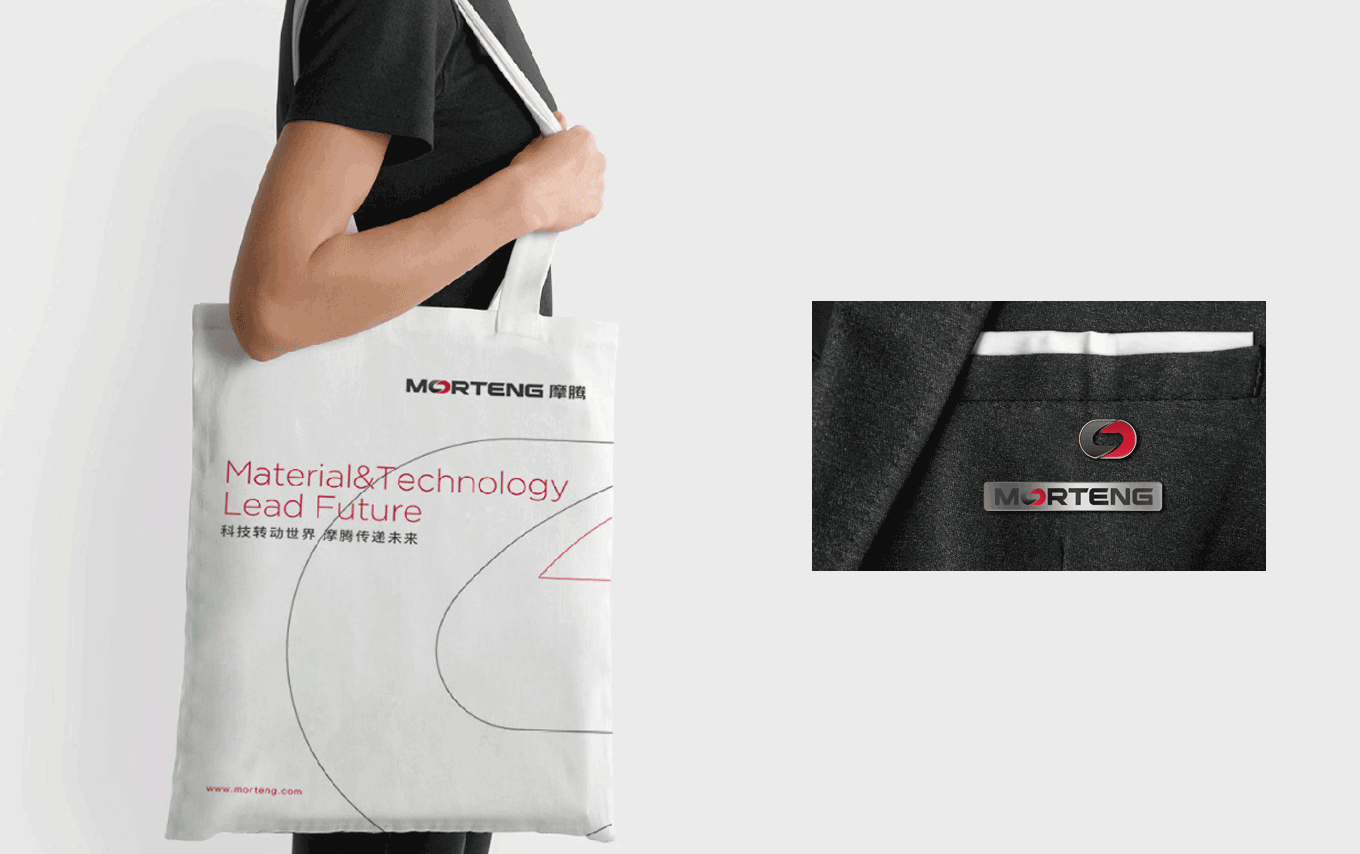 MORTENG 英文字體標識,將字母“O” 作為主要識別點,形成了一個無限循環轉動的環形,其不僅具有摩騰科技的產品屬性——象征滑環、碳刷等產品的運作特性;其次,圖標的負形也巧妙地形成了“能源符號” 的圖形感,象征著摩騰在風電、傳動、線纜等能源科技領域所具有的“無限能量”。在顏色上也選用“能量感” 極強的紅色作為主要識別色,使摩騰品牌在行業領域中脫穎而出。