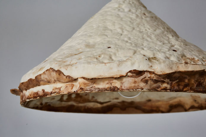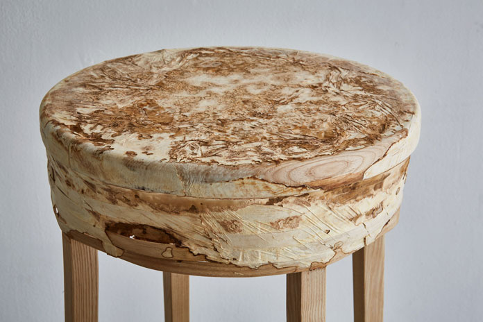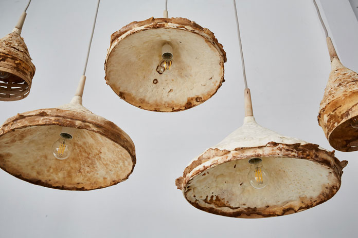 Mushroom mycelium daily necessities design, using the weathered interior design created with mushroom mycelium, studied the potential of article VI design mushroom mycelium in contemporary interior design. Use this fungus material to make a series of daily necessities. Their "Mycelium + Wood" series includes various stools and lights. Each element has a suede-like texture.
